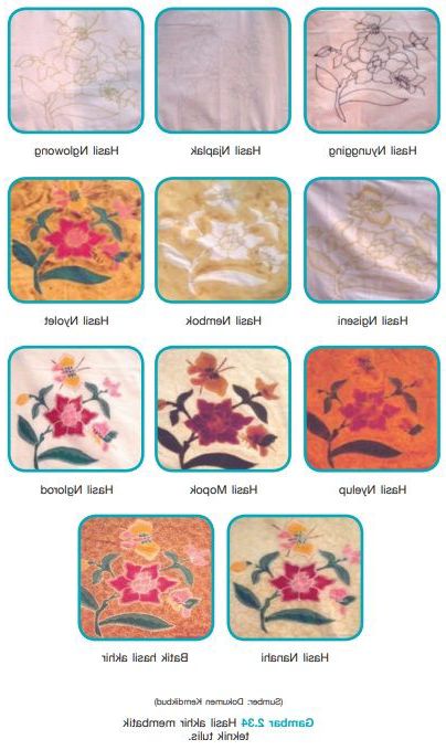 Teknik yang digunakan dalam mewarnai kain tekstilnya menggunakan teknik tutup celup. Kerajinan batik ini merupakan warisan budaya nusantara dan menjadi ciri khas kebangsaan bangsa Indonesia.